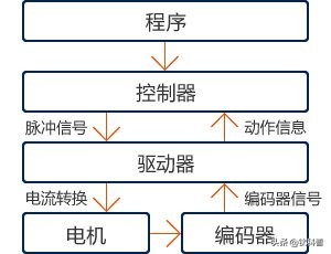 程序控制器(脈沖信號)驅(qū)動器(電流轉(zhuǎn)換)電機編碼器(編碼器信號)驅(qū)動器(動作信息)控制器