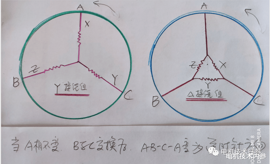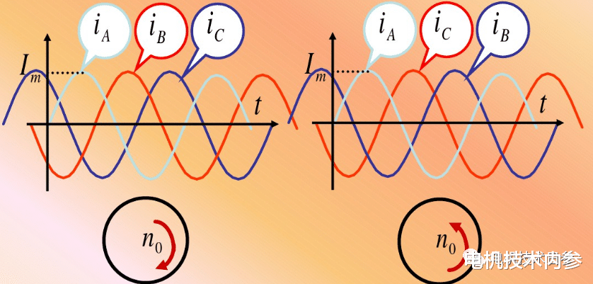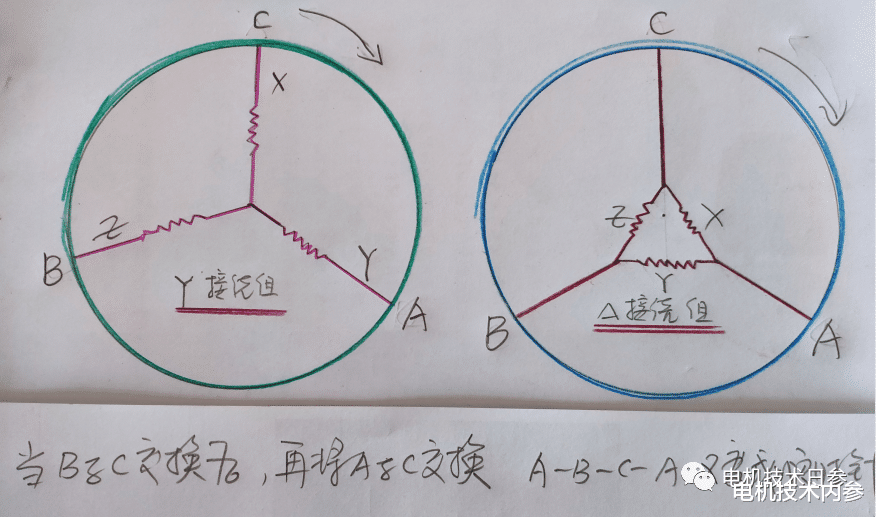 當(dāng)A相的連接保持不變時(shí),B相和C相的連接互換,自然定子磁場(chǎng)就是A-B-C逆時(shí)針旋轉(zhuǎn)。